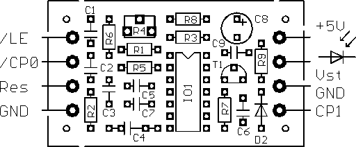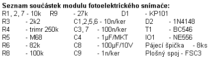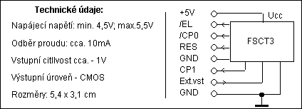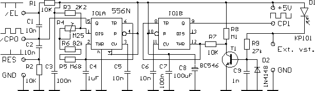 Elektrické impulsy z fotodiody D1, nebo z externího vstupu (vývod ext. vst.) jsou přivedeny do integrovaného obvodu IO1B - NE556, který vytváří impulsy pravoúhleho průběhu pro další zpracování v modulu čítače. Druhá polovina časovače NE566 vytváří vlastní časovou základnu otáčkoměru. Aktivní délka hradlovacího impulsu na výstupu IO1A vývod 5 je 0,6s a je určena hodnotou kapacity kondenzátoru C4, odporu rezistorů R5, R6 a nastavením odporového trimru R4. Rozsah měření otáčkoměru lze změnit podle potřeby změnou hodnot C4, R5, R6, R4. Výstupy /EL, /CP0, RES jsou pro řízení modulu čítače. Přivedením signálu na vnější napěťový vstup umožňuje otáčkoměr měřit otáčky automobilových motorů. V tomto případě nezapojujeme fotodiodu D1, nebo ji dokonale zastíníme, aby nebyl ovlivňován externí vstup. Pro měření otáček s rozsahem 0 - 99900 ot/min čtyřdobého čtyřválce, změníme C2 na 470nF, R4 na 250k, R5 na M68, R6 na M12. Hradlovací impuls se pak zkrátí na 0,3s. Signál z přerušovače přivedeme na externí vstup a zem. Napájecí napětí je blokováno kondenzátory C3, C7, C8.
