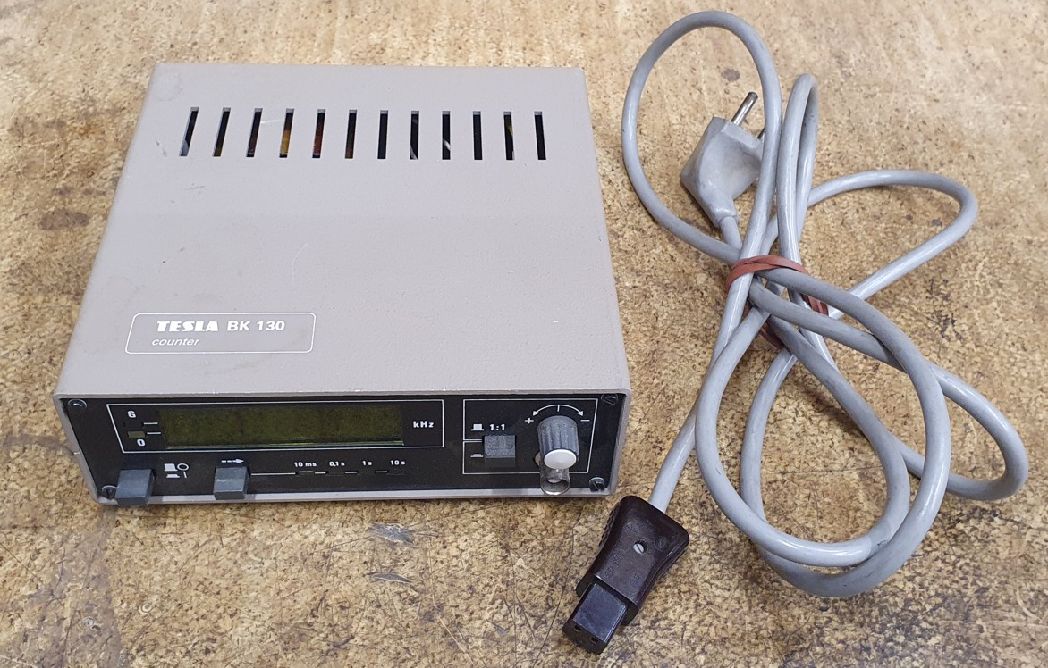 Školní čítač BK130 včetně napájecího kabelu. Bez dalšího příslušenství. Po zapnutí svítí, u 10sec rozsahu nesvítí Led dioda, pravděpodobně je vadná. Segmentovky svítí všechny.