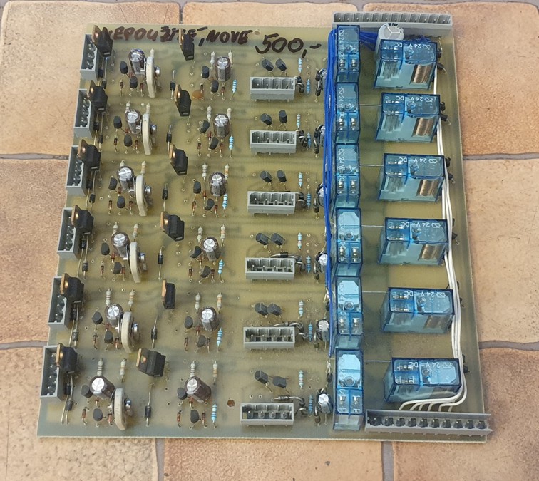 Plošný spoj osazený 12ks tranzistorů BD244C a 12ks relé Finder 40.52 24Vss 2x8A 2x přepínací kontakt. Deska nebyla nikdy zapojena. Skladem 2ks desek.
