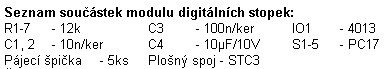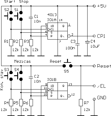 Stopky jsou ovládány pěti tlačítky: start, stop, mezičas, konečný stav a reset. Stopky se spouští tlačítkem start. Chceme-li kdykoli v době měření zjistit mezičas, stiskneme tlačítko mezičas, na displeji se zobrazí časový údaj a přitom stopky měří nepřetržitě dál. Konečný stav čítače se zobrazí stisknutím tlačitka kon. stav. Chceme-li měření ukončit, stiskneme tlačítko stop. Sepnutím spínače reset se na displeji zobrazí stav 000. Výstupy CP1, RES, /EL, GND propojíme s modulem čítače CT3. Pro měření času do 999s přivedeme impulsy o kmitočtu 1Hz, pro měření času do 99,9s přivedeme impulsy o kmitočtu 10Hz, na vstup modulu čítače /CP0. Z časové základny pro čítač použijeme pouze impulsy ze špiček 1Hz a 10Hz. Ostatní signály z časové základny nepoužijeme.